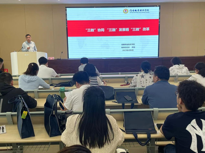 开班仪式结束后,beat365官网教务处处长余磊受邀作为培训班开班第一讲。余磊以《“三教”协同,“三融”发展看“三教”改革》为题,从“职业教育大发展的时代背景”、“职业教育提质培优行动计划”、“职业教育大有作为下的三教改革”三个
