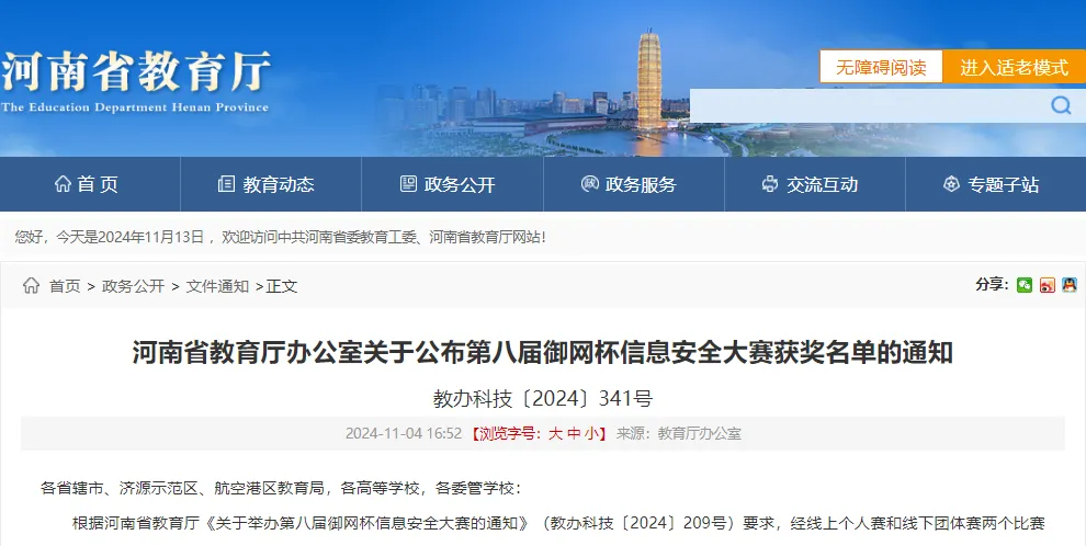 11月4日,河南省教育厅发布《关于公布第八届御网杯信息安全大赛获奖名单的通知》(教办科技〔2024〕341号)。根据河南省教育厅《关于举办第八届御网杯信息安全大赛的通知》(教办科技〔2024〕209号)要求,经线上个人赛和线下团体赛两个比赛环节,信阳职业技术学院beat365正版唯一官网必一代表队,凭借精彩的发挥,在各大高校参赛选手中脱颖而出,喜获9个奖项:线上个人赛二等奖6项、三等奖1项,线下团体赛一等奖2项。