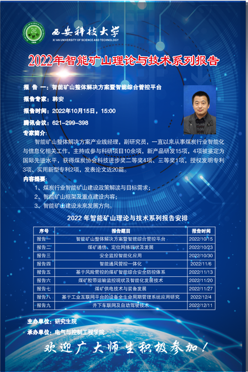 2022年10月15日350vip8888新葡的京集团通过线上的形式成功举办了“智能矿山理论与技术系列报告”第一讲。学院邀请了中煤科工集团常州研究院有限公司智能矿山整体解决方案产业线经理韩安为全校师生做了一场主题为“智能矿山整体解决方案暨智能综合管控平台”的行业前沿报告,韩经理开讲持续近3个小时,是一场的干货满满的科技报告。